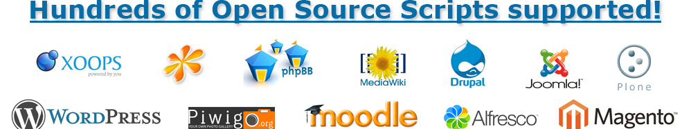 We support all major Open Source Scripts available. Some of the scripts that you may have heard of are WordPress, Joomla, phpBB, Moodle, concrete5, SugarCRM, Xoops and ZenPhoto.